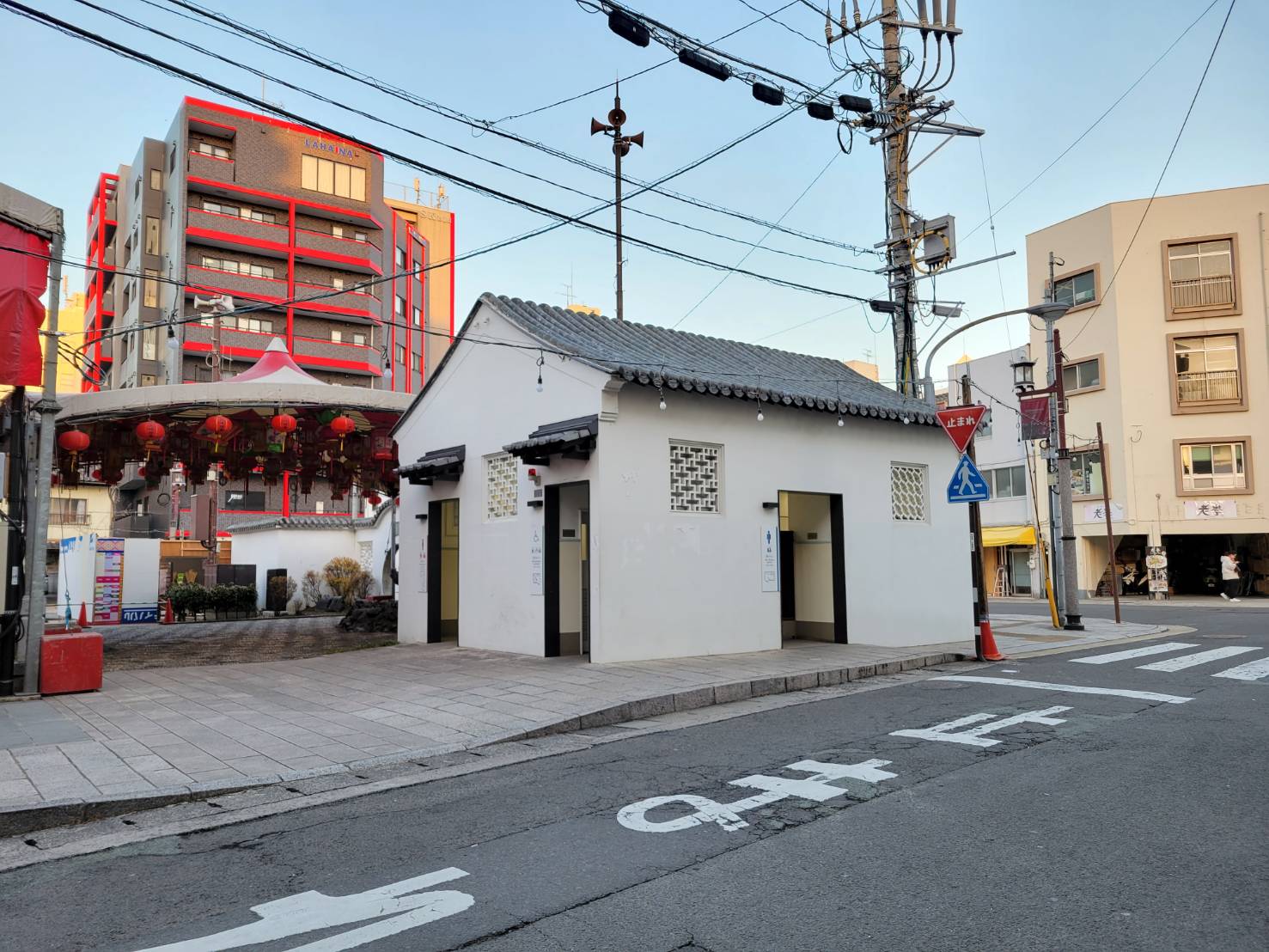 新地中華街すぐの場所にある湊公園。公園の角に公衆トイレがあります。真っ白の外観が特長。