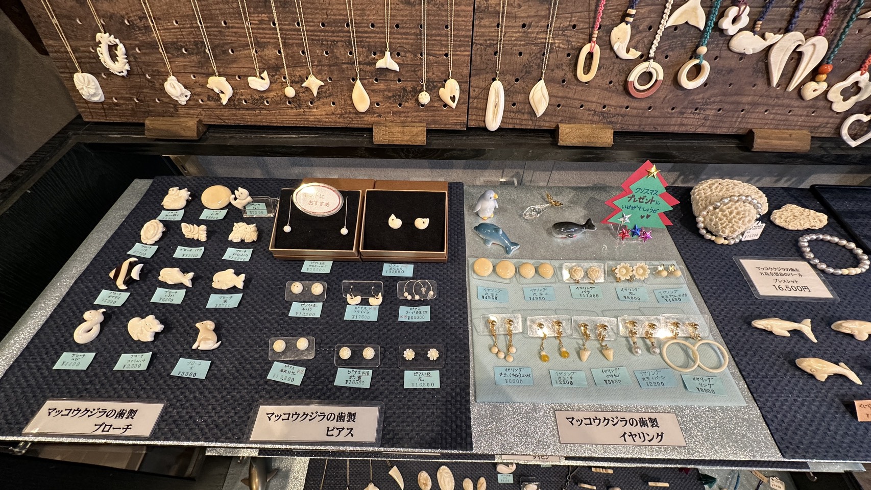 店内に並ぶくじら工芸品は、当店の職人が一つひとつ手作業で制作しています。