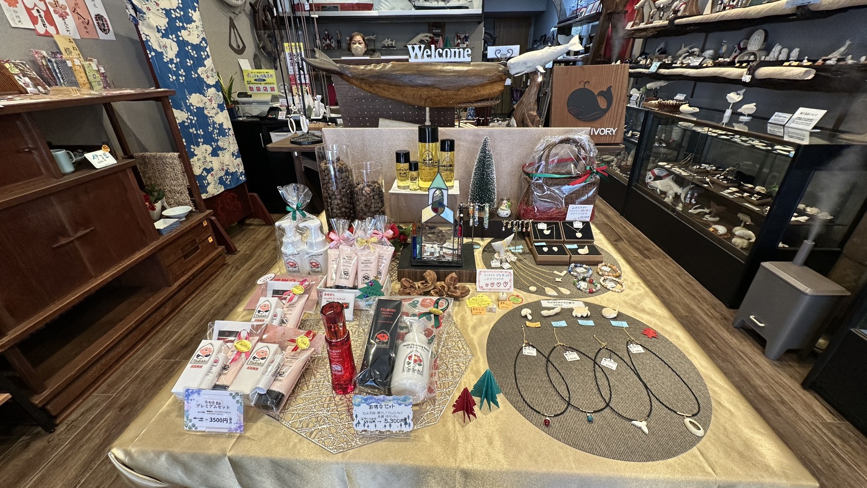 マッコウクジラの歯を使用した「くじら工芸」と、「椿油」を取り扱っています。