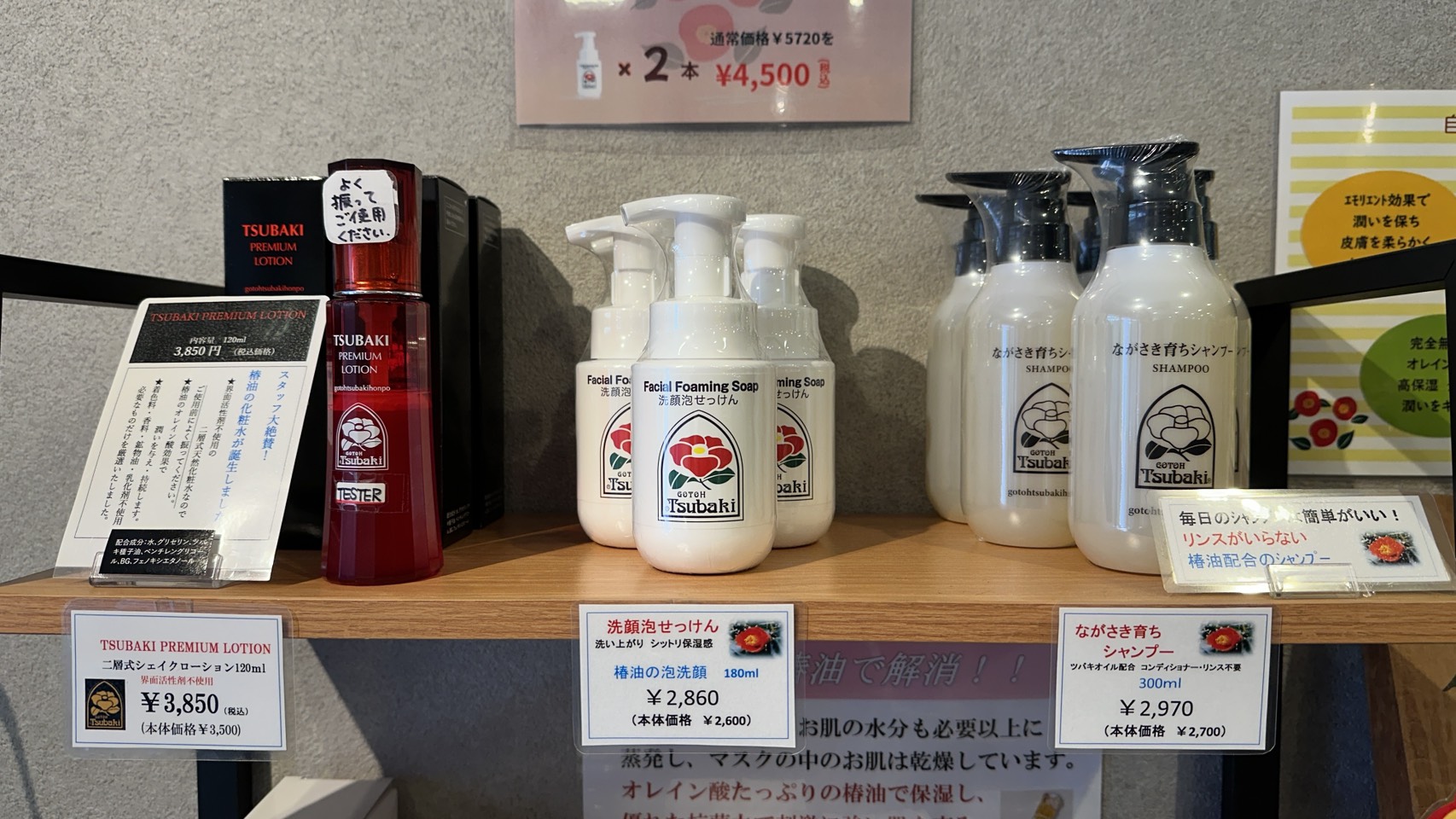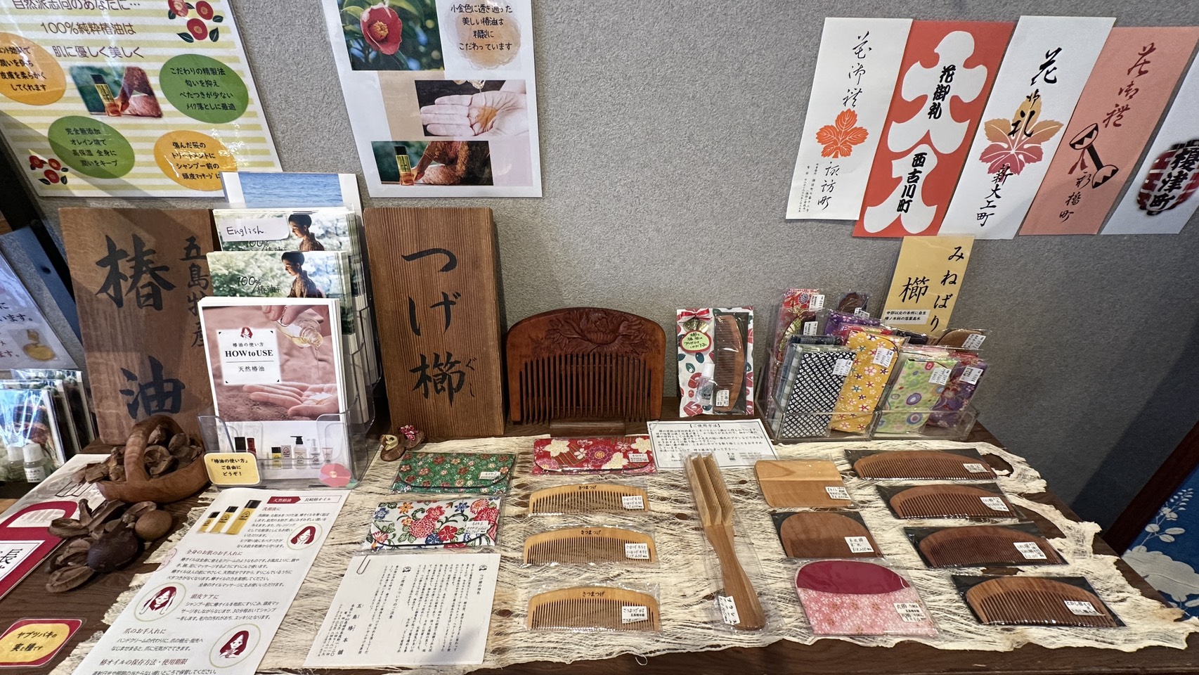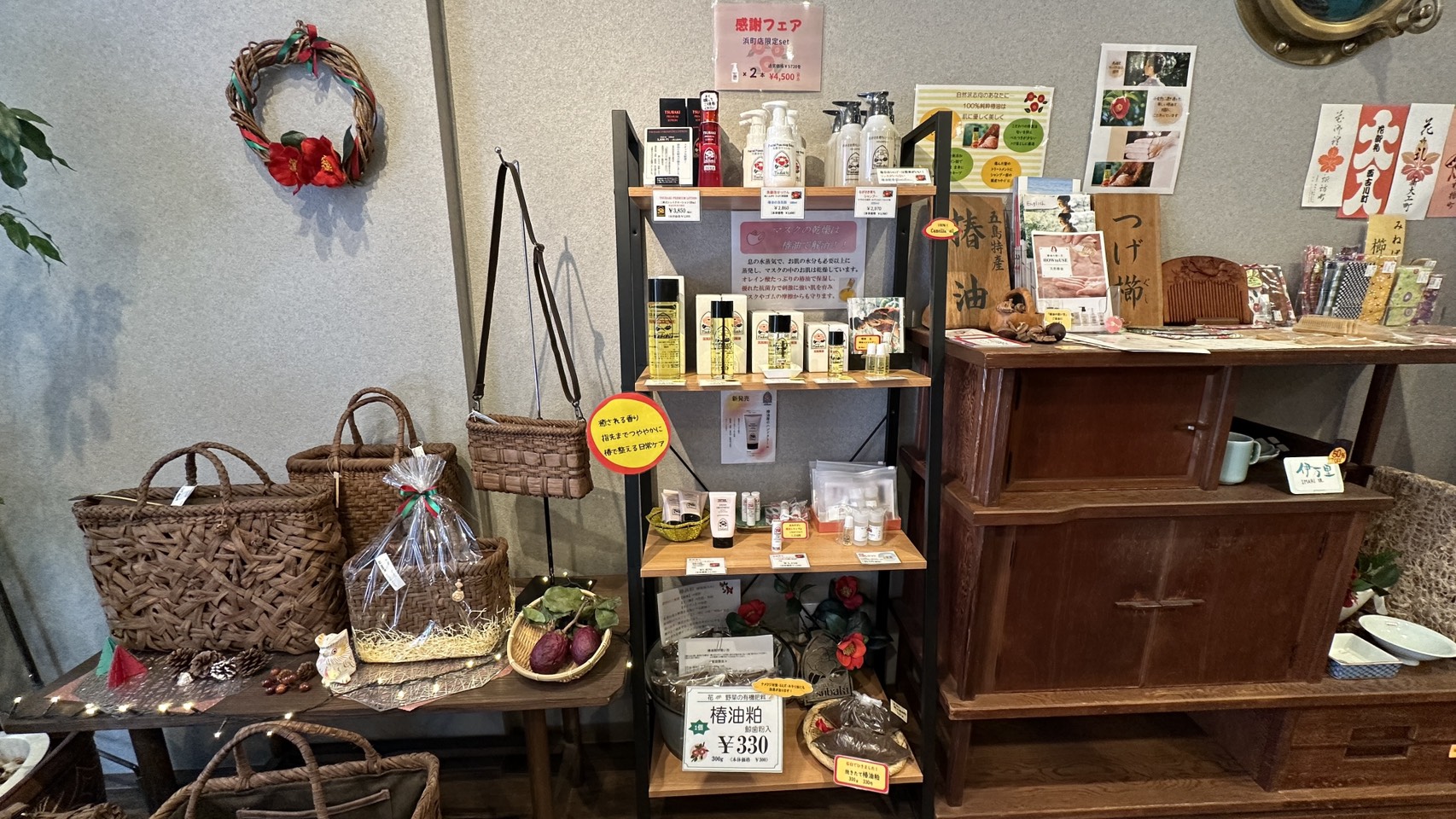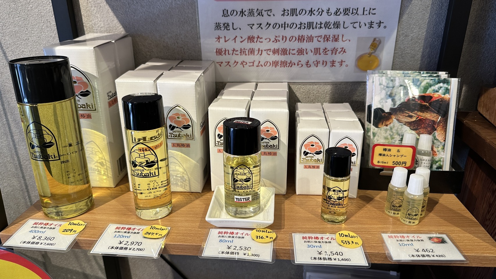 店内には椿油を使ったシャンプーや、べたつかず使いやすいハンドクリームなども並び、長く愛用しているリピーターも多く見られます。