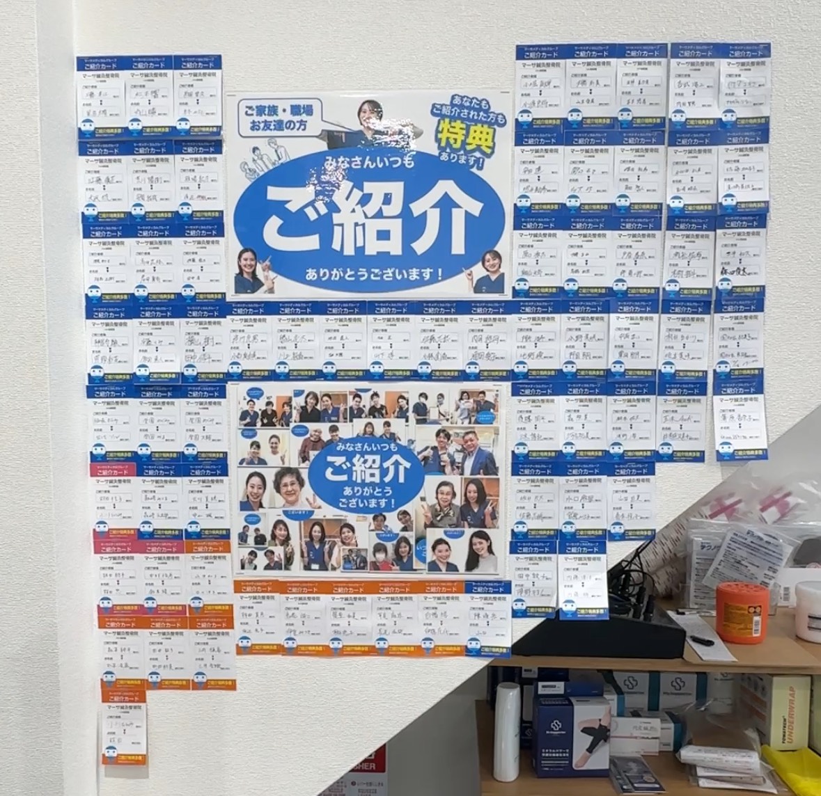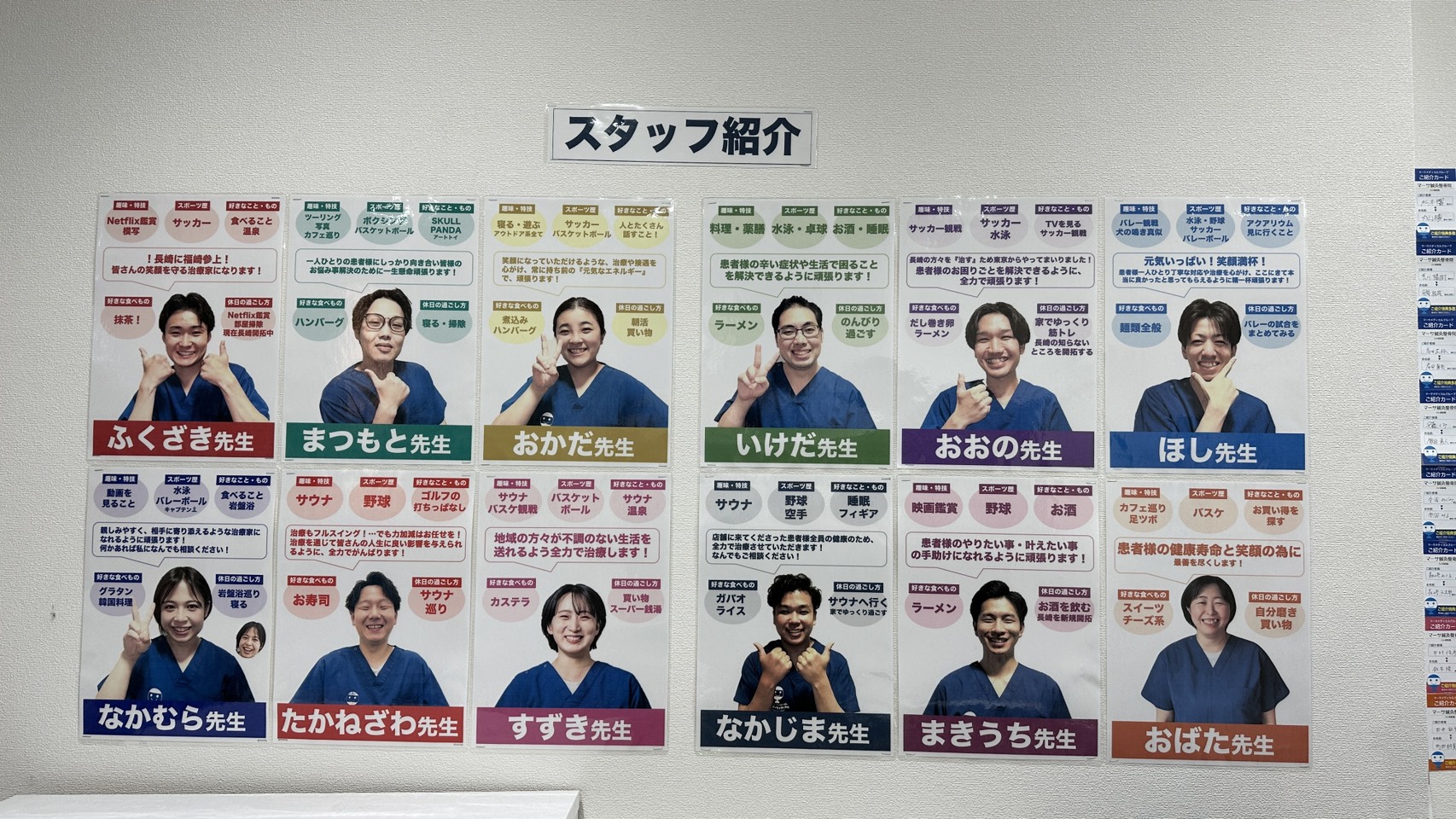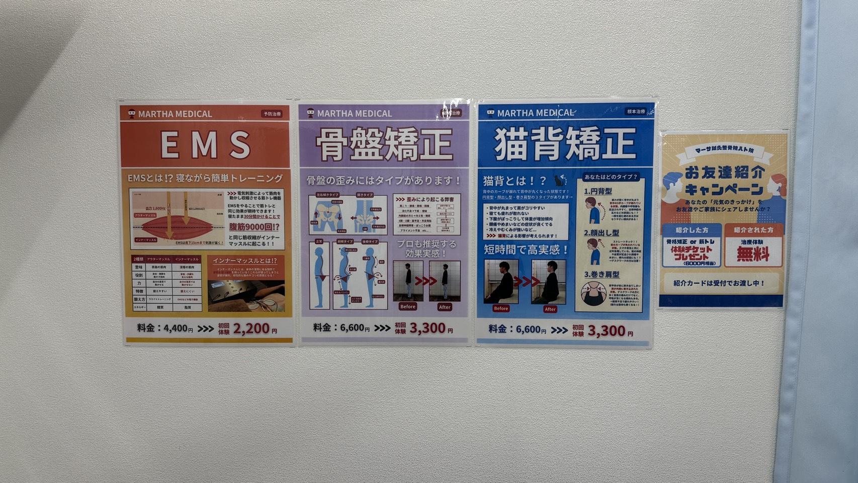 院内には骨盤矯正や猫背矯正、EMSなどの案内も掲示されており、症状や目的に合わせた幅広い選択肢が用意されています。