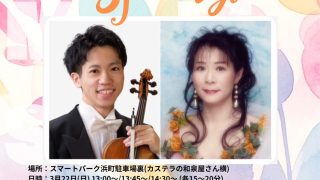 3月22日(日)は、県外からのゲスト奏者を迎え、春の訪れを感じる「浜んまち街角コンサート」が開催されます!今回の演奏は、ヴァイオリンの飯田拓斗さんと、長崎で活動するピアニスト後藤美樹さんによるデュオ。浜の町のアーケードにクラシックの名曲がや...